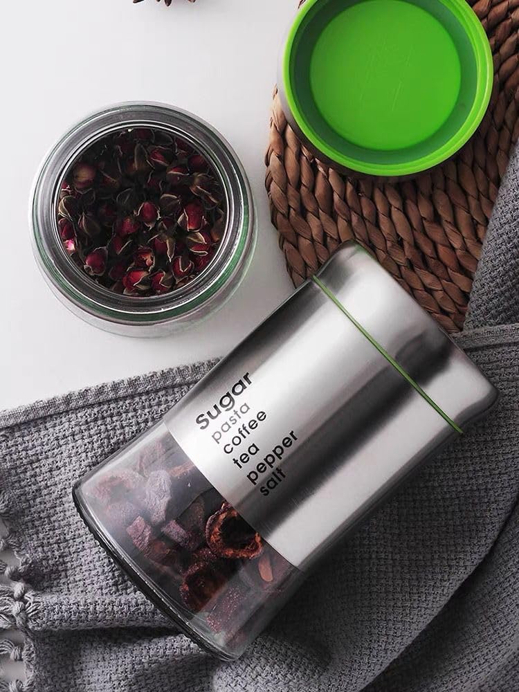 - Perfect for storing spices, sugar, coffee, tea, dry fruits, or snacks