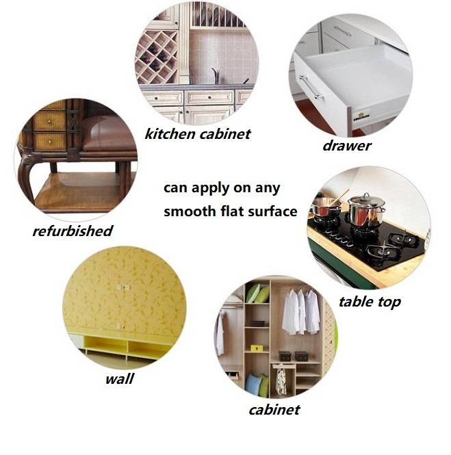 - Kitchen Cabinets ,Counter Top ,Shelves, Walls ,Pantry Areas ,Dishwashers, Dishwasher Panels, Oven Hood, Refrigerators ,Appliance , Instant Peel And Apply To Flat Surfaces.